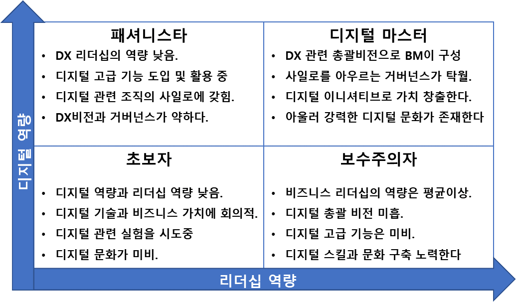 디지털 마스터의 4가지 유형의 기준은 디지털 역량과 리더십 역량이다. 이 두 가지 역량은 본 연구에서도 지속해서 언급할 것이고 이 두 가지 역량이 함께 성장하고 적용될 때 비로소 DX의 결과들이 나타나기 시작한다. 이 DX의 4가지 유형을 요약하면 아래와 같다.