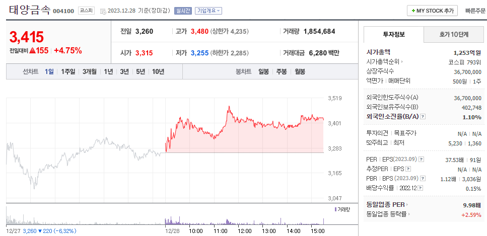 2) 동일 업중 PER 평균이 9.98배, 태양금속 37.53배. -> 이미 고평가됨
